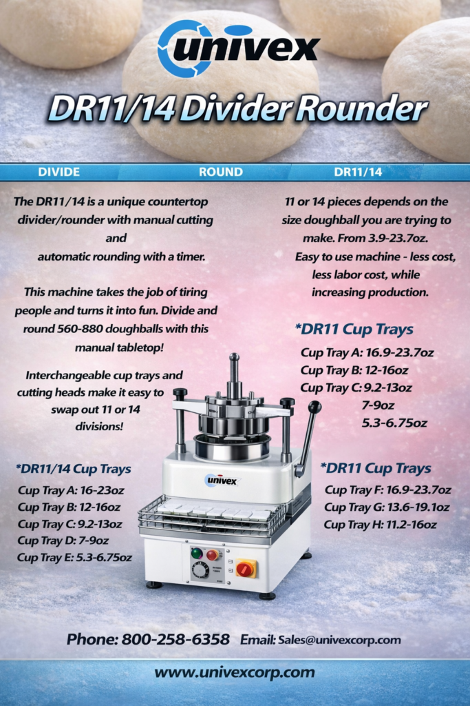 News Round it Out with Univex’s Counter Top Divider/Rounder Your one-stop guide to the DR11/14Access Spec Sheets, Applications and FeaturesChef Toby demonstrates how efficient the DR11/14 is — Watch it here!Want to learn more about the DR11/14 and our full line of Divider/Rounders? Email us: [email protected]1-800-258-6358 Add Your Heading Text Here